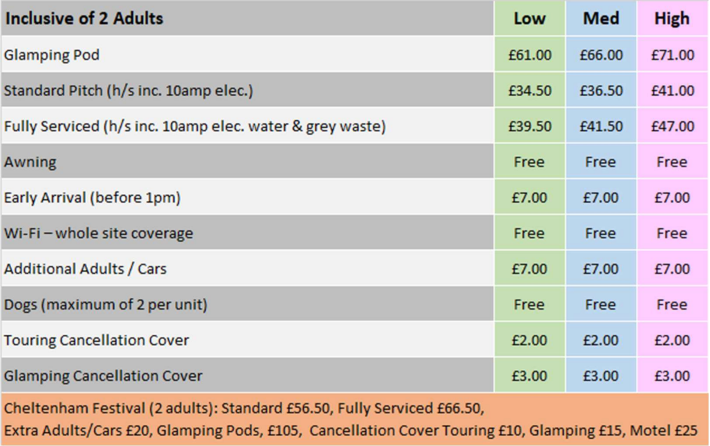 - ✔ Premium, Standard, Grass Pitches all inclusive of electricity